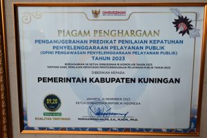 Pemerintah Daerah Kabupaten Kuningan sendiri meraih nilai 89,28 berpredikat kategori A (kualitas tertinggi), yang berarti Kuningan berada di zona hijau atas hasil penilaian kepatuhan penyelenggaraan pelayanan publik oleh OMBUDSMAN.